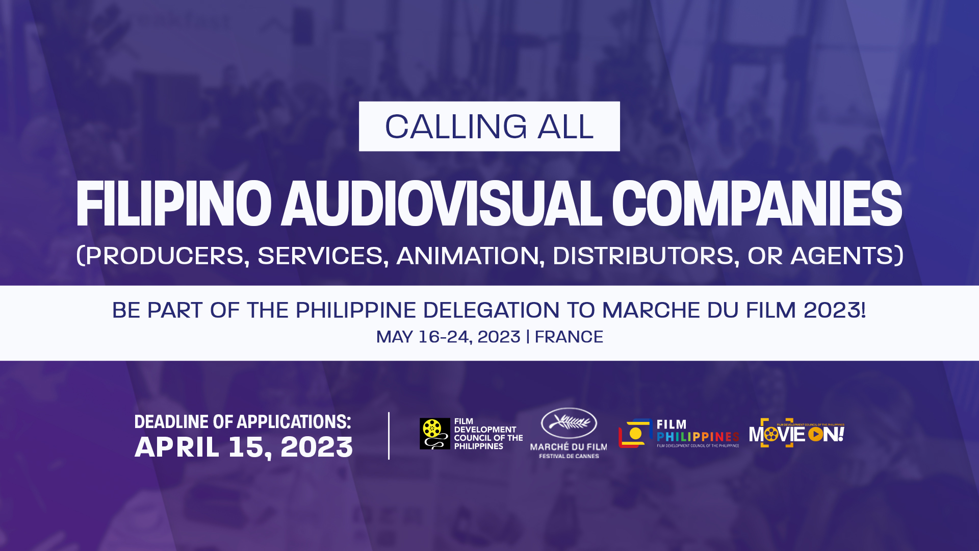 MANILA, PHILIPPINES, MARCH 23, 2023 — The Film Development Council of the Philippines (FDCP) is looking for Filipino audiovisual companies involved in production, production-related activities, line production, post-production, and animation to be part of the Philippine delegation to the Marché du Film 2023, the business arm of the prestigious Cannes International Film Festival happening from May 16 to 24 in France.