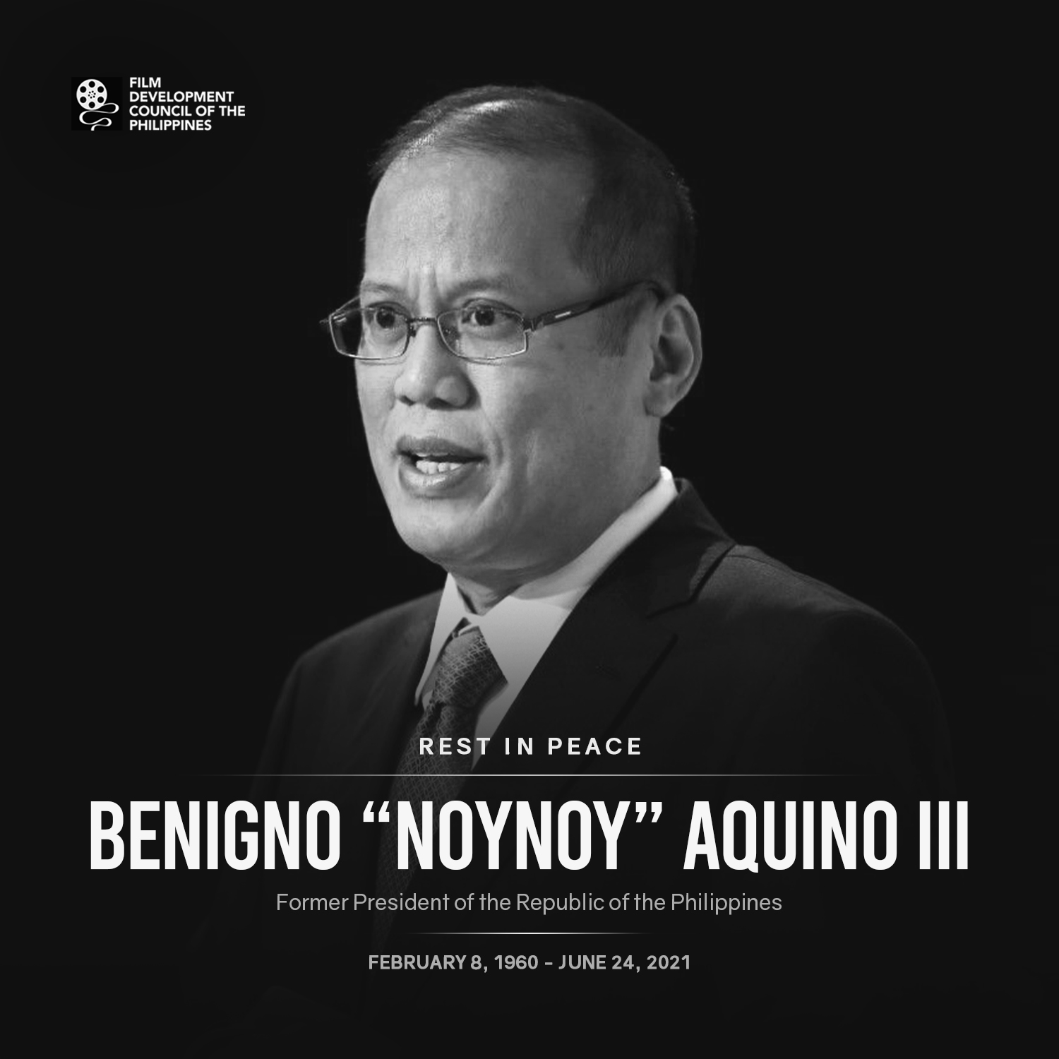 The Film Development Council of the Philippines (FDCP) mourns the demise of former Philippine President Benigno Simeon "Noynoy" Cojuangco Aquino III, who passed away on June 24, 2021, at the age of 61.
